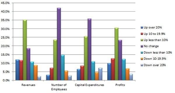 One CEO attributes the steady, albeit tepid, numbers to individual company performances versus business conditions as a whole, “Individual companies may do well coming out of the recessions, but the cyclical economy will accelerate. This will be exacerbated by poor domestic policy in a world of countries hungry to compete.”