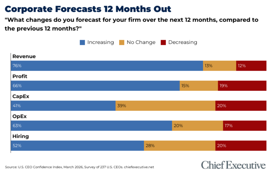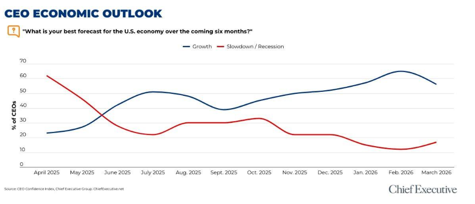 At the same time, signs of caution are emerging. The share of CEOs forecasting a potential slowdown rose to 17 percent in March, up from 12 percent in February—the first increase in six months (since October 2025).