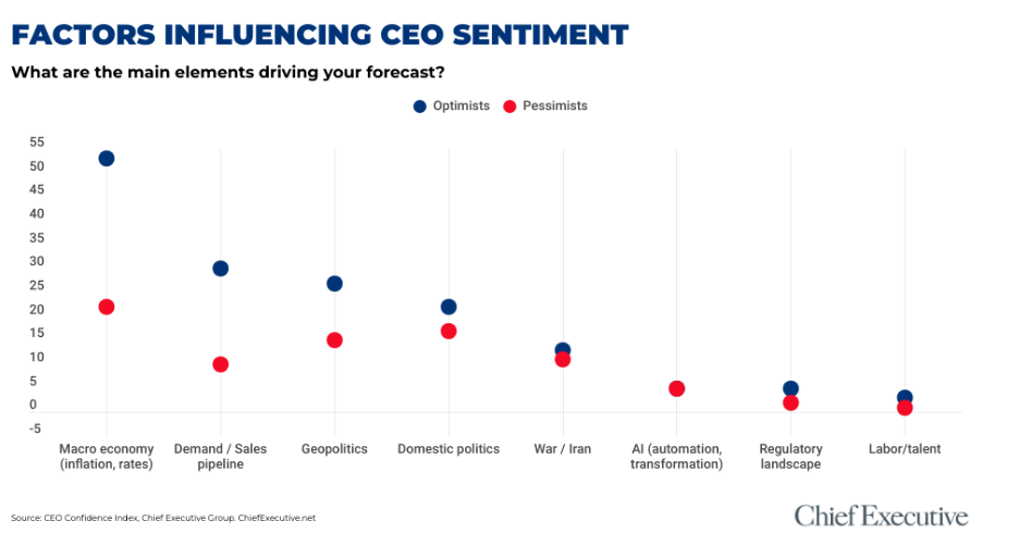 These concerns also appeared among CEOs with a more optimistic outlook, though far less frequently than economic or demand-related factors. About one quarter of CEOs expecting conditions to improve mentioned geopolitics, while 20 percent cited domestic politics. Only 12 percent referenced the war in Iran specifically.
