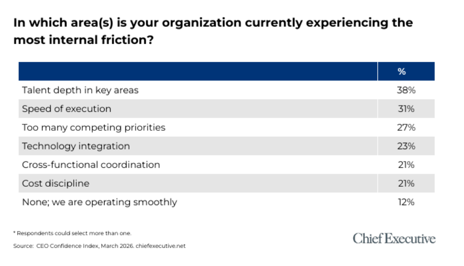 But CEOs say their biggest challenge is talent depth in key areas—not overall headcount—suggesting the issue is finding specialized skills rather than simply adding workers.