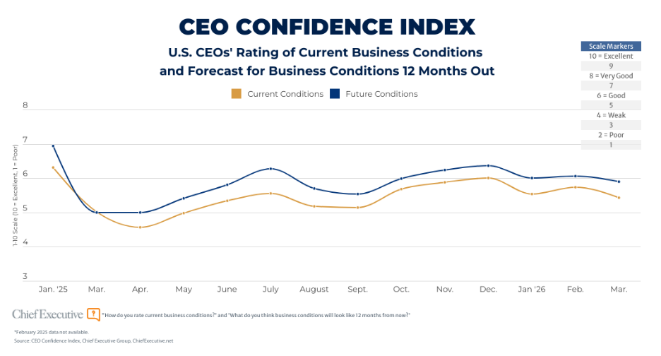 Chief Executive’s March CEO Confidence Index—fielded March 3-4 among 237 U.S. chief executives—shows CEOs lowering their assessment of current business conditions by five percent, to 5.4 out of 10 from 5.7 in February.