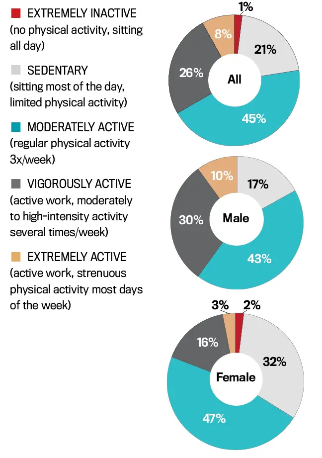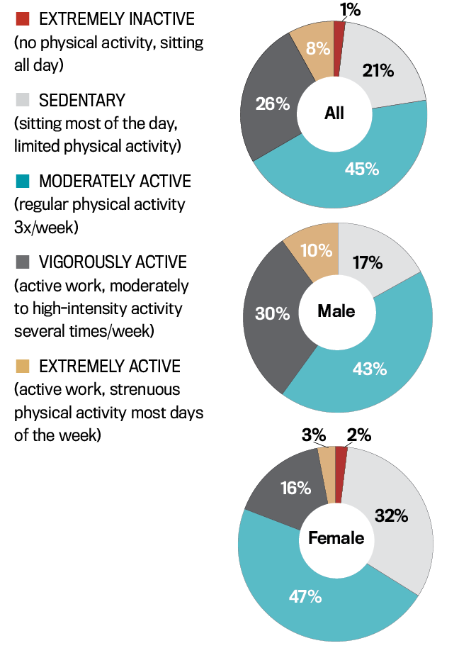 Forty percent of male executives report vigorous/extreme-level activity vs. 19 percent of women, and women are more likely to identify as “sedentary” (32 percent vs. 17 percent of men).