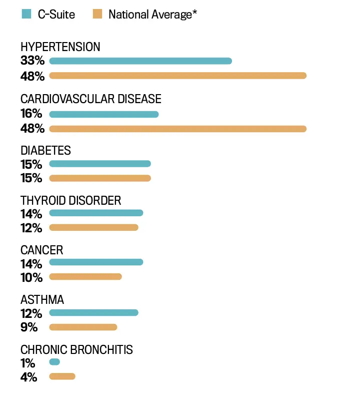 Among executives who are experiencing health issues, hypertension (33 percent) and cardiovascular disease (16 percent) top the list of most common afflictions but at far lower rates than the national average of 48 percent.