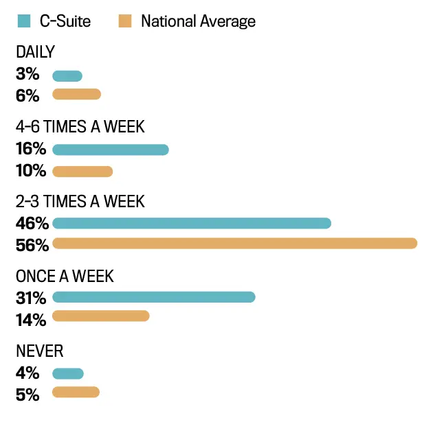 To counteract all this, America’s C-Suiters are generally an active bunch: 78 percent of respondents exercise at least three times weekly, with one-third classifying their routines as vigorous or extreme, compared to only 25–30 percent of Americans meeting the CDC’s physical activity guidelines.