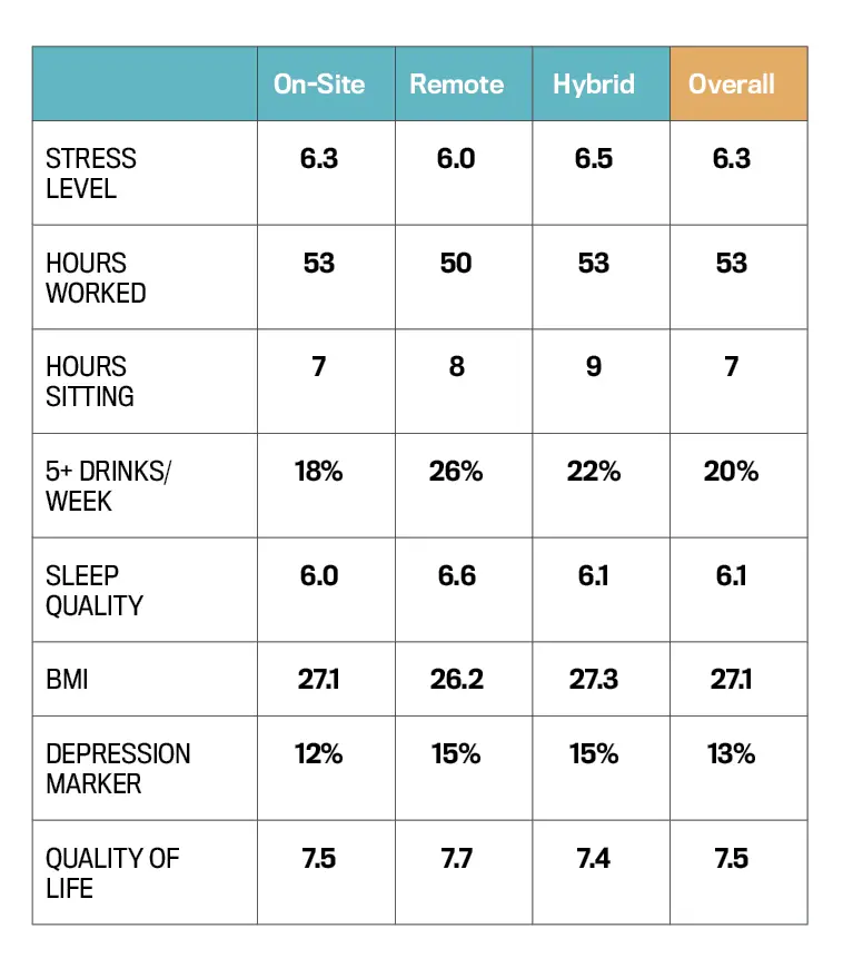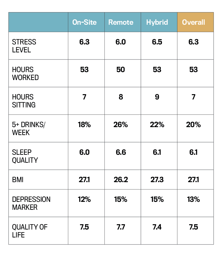 From a health perspective, there are pros and cons to each. Hybrid executives report the highest stress level (6.5), while fully remote leaders log fewer hours and report a higher quality of life—though they are most likely to drink more than five alcoholic beverages per week. Meanwhile, those who work primarily on-site report the lowest depression risk rate, lower alcohol consumption and fewer hours sitting, though also the lowest sleep quality.