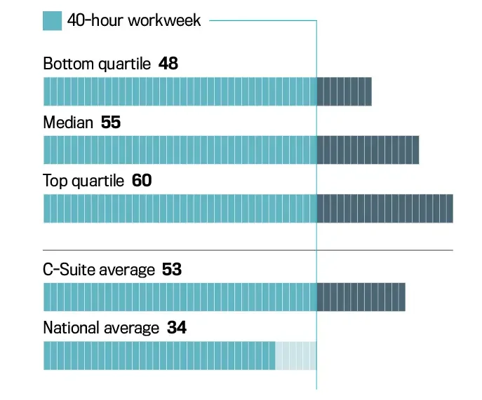 That need to be in top shape is easy to understand based just on the hours C-Suite executives report working: an average of 53 hours per week, nearly 20 hours more than the U.S. national average of 34 hours reported by the St. Louis Fed this year.