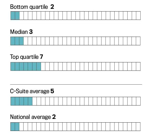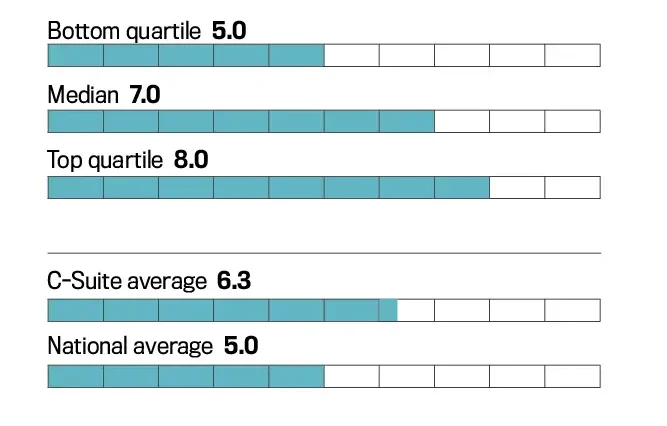 Most important, despite the stress and workload, C-Suite executives generally rate their quality of life higher than does the broader population: 82 percent of executives score themselves at 7 or more on a 0–10 scale, vs. 49 percent of U.S. adults (Gallup, 2025). And their average rating is a healthy 7.5.