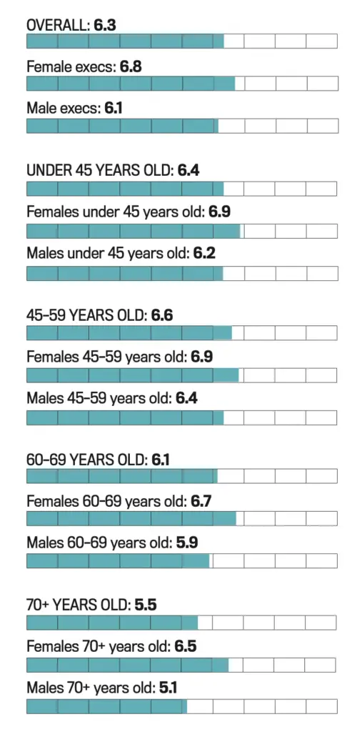 Age also plays a factor. Executives under the age of 60 record the highest stress at 6.5 on average, while reported stress levels among those over 80 drop to 5.0, as experience tempers strain. “We’re not seasoned,” agrees Turakhia, who is in her 40s. “And then having to compare with the baby boomer generation and their work ethic…. It’s a lot of pressure.”