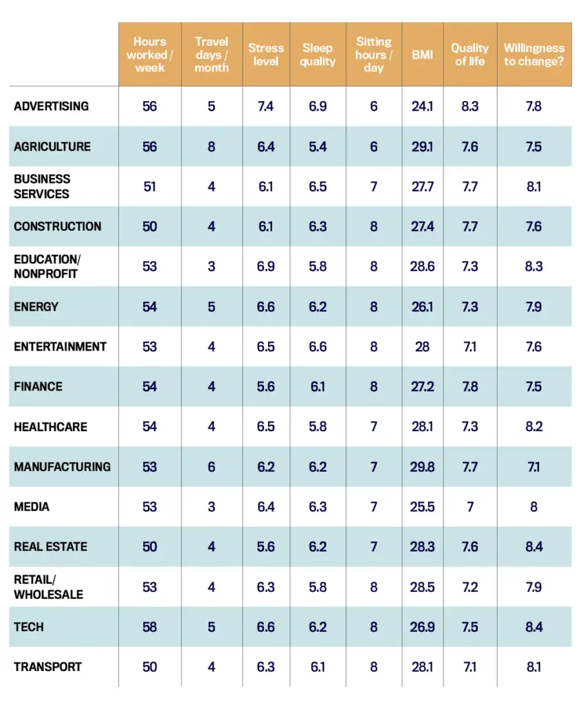 While C-Suite leaders across industries face similar pressures, the data reveals that the sector where you lead matters. Tech executives are burning the midnight oil with the longest work weeks, agriculture leaders are racking up frequent flyer miles, and advertising execs have mastered an intriguing paradox—reporting both the highest stress levels and the best quality of life. Below, see how health and wellness metrics stack up across 15 sectors.