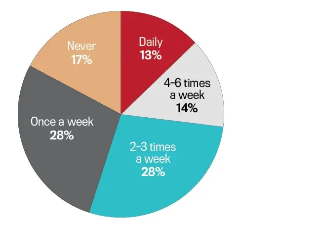 Convenience is also a factor: Two-thirds of executives rely on restaurant or prepared meals two or more times weekly, averaging three times—similar to national trends (72 percent). Turakhia attributes that frequency to the demands of busy travel and meeting schedules. “We’re going from sunup to, quite frankly, sometimes the very next day; meetings, entertainment, drinks, et cetera, they all lead to a really crappy week when we’re on the road.”