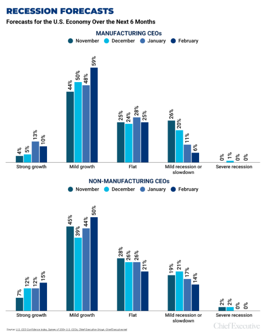 Another good sign from manufacturers is the growing proportion who forecast economic growth over the next 6 months. This proportion climbed to 69 percent in February, up from 61 percent the month prior. Similarly, a growing percentage of CEOs in industries other than manufacturing also forecast economic growth over the next six months, at 65 percent in February vs. 59 percent last month. They are slightly more reserved with their forecast than manufacturers, with 14 percent forecasting a slowdown, compared to only 6 percent of manufacturers who forecast the same.