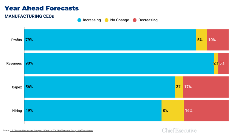 Part of the reason that forecasts are stalling may also be due to cost increases. 68 percent of manufacturing CEOs overall report increasing operational expenditures, regardless of international exposure. Additionally, manufacturing CEOs overall estimate the inflation rate to come in at 3.0 percent over the next 12 months, on average, higher than the 2.7 percent figure from the previous 12 months.