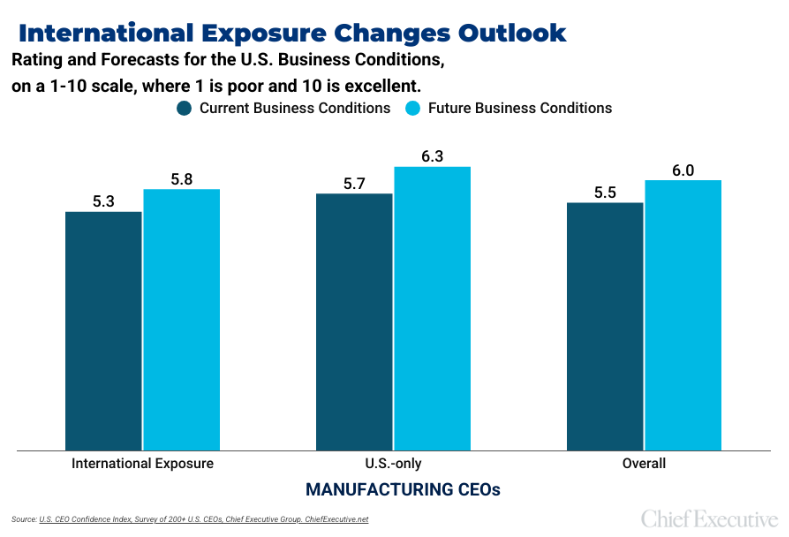 Still, international exposure plays a large role in manufacturing CEO sentiment this month, with wide gaps between manufacturers who operate internationally vs. U.S. only manufacturers emerging. Manufacturing CEOs with international exposure rate current business conditions at 5.3 out of 10 and forecast future conditions at 5.8—both notably lower than their U.S.-only counterparts, who rate current conditions at 5.7 and forecast future conditions at 6.3. This displays that internationally exposed manufacturers are pulling down the aggregate figures amid heightened concerns around tariffs, trade tensions and geopolitical instability. However, the data suggests manufacturers with international operations may be taking a proactive approach, with 66 percent planning increases to capex over the next 12 months, compared to only 40 percent of U.S.-only manufacturers.