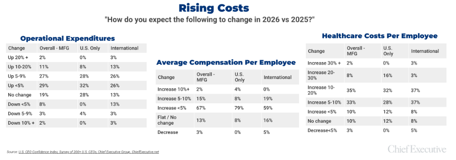 When looking more granularly, double the proportion of manufacturers with international exposure forecast operational expenditures to rise by 10 percent or more in 2026 vs. 2025, compared to U.S.-only firms─at 16 percent for those with international exposure vs. only 8 percent for U.S.-only. When it comes to increasing compensation per employee, 92 percent of U.S.-only manufacturers are forecasting increase vs. only 79 percent of manufacturers with international exposure. Similarly, a rough weighted average increase in healthcare costs per employee estimates that U.S.-only manufacturers are expecting an increase of over 11 percent, compared to around 10 percent for manufacturers with international exposure.