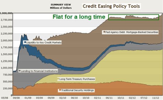 In graph form, we can see that the Fed’s asset balance had been holding steady at around $2.75 trillion for a bit over a year. But then the latest round of QE (QE4) began, which has swelled the Fed balance sheet above than $3 trillion and it’s way to (at least) $4 trillion by year end (2013).