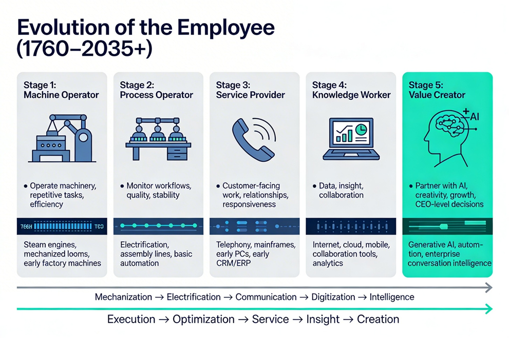 Instead, each wave has reshaped not only what employees do but also which skills they must master to create value inside organizations. Today, AI and enterprise-level intelligence platforms are catalyzing a shift toward employees as empowered value creators and growth drivers, rather than mere executors of tasks or custodians of processes.
