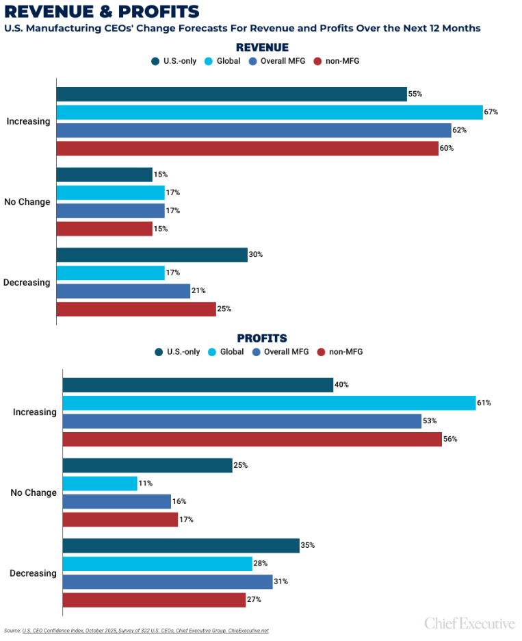 Of particular note this month is the rise of global manufacturers who expect increases to revenues and profits over the next year, which was steadily below the proportion of domestic-exclusive CEOs for months. This is ironic, considering the increased stressors they face by being involved in international trade networks.