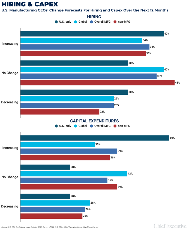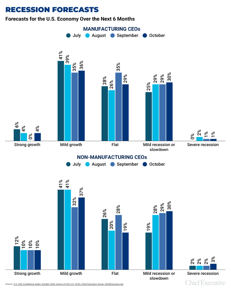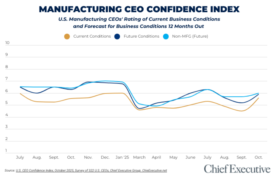 According to Chief Executive’s latest CEO Confidence Index survey, conducted October 7 and 8, manufacturing CEOs rate current business conditions a 5.6 out of 10, on a scale where 1 is Poor and 10 is Excellent. Up 24 percent from last month’s poor rating of 4.5, this is the closest manufacturers have been to recuperating the March 2025 nosedive in current confidence.